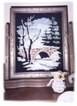 Bridge over creek with trees. Purchased at Pic `N Sav for one of the museum founder’s good friends to commemorate her birthday. In secret the recipient painstakingly painted this masterpiece and gave it back to the museum founder for her birthday. Certainly the definition of a great friendship plus an outstanding example of painted by numbers. We like everything about it except that it’s unsigned.