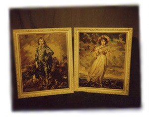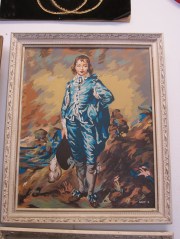 Blue Boy and Pinkie. These classic paint by numbers portraits which are signed by Gary S. were purchased as a pair. Perhaps we paid too much ($ 20.00) but the frames were included. We feel the artist was able to capture the innocence that the original Gainsborough and Lawrence paintings evoked especially in his treatment of their faces. If you stare intently you’ll note Pinkie’s crossed eyes in particular. Perfect anywhere, this handsome pair currently hangs over our dressing table exhibit lending an air of romance and sophistication, don’t you think?