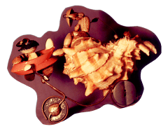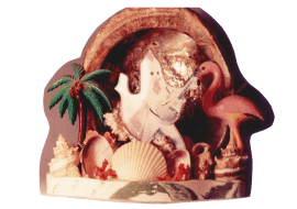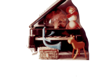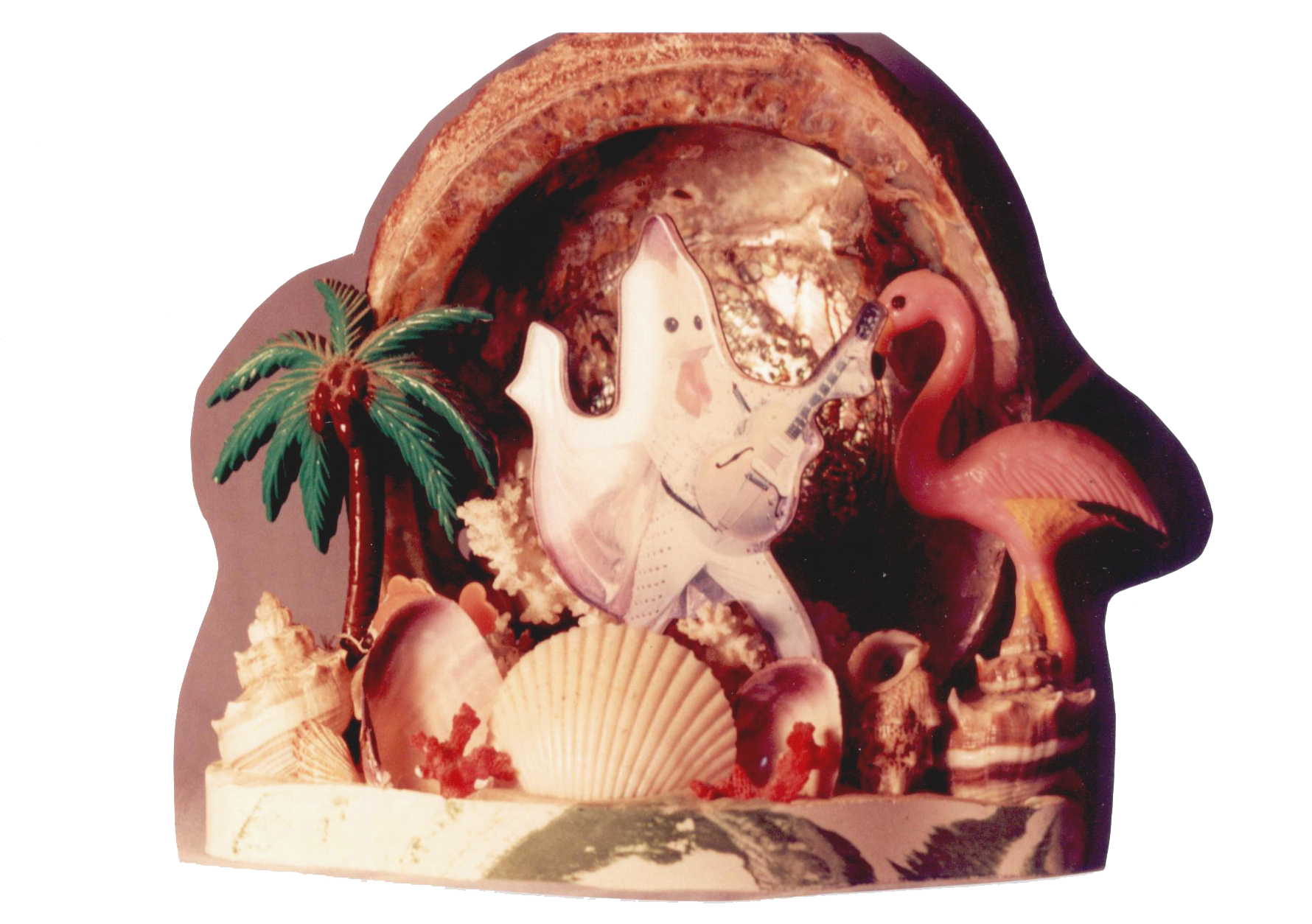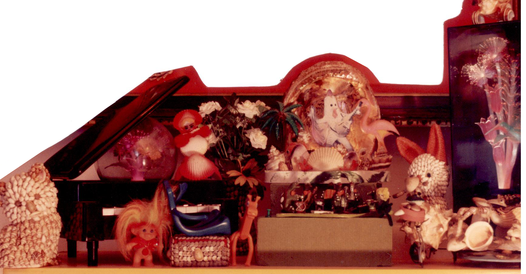 Piano with revolving, color changing lighted globe. The opening act is about to begin. It’s none other than that accomplished pianist Gumby and his bodyguard Pokey playing accompaniment as diva in red (could this be a shell depiction of Madonna?) belts out a few choruses of Material Girl. A few words about this unique piano are in order. Not only does the clear globe light up and revolve, but by hitting a piano key you can hear the sensuous sounds of more than a dozen of your favorite classic tunes, including My Darling Clementine, London Bridge is Falling Down, Row, Row, Row Your Boat, Lullaby and Good Night or simply Happy Birthday. Where you might ask would such a real treasure come from? Kudos to two dear friends for locating thisunbelievable example of form meeting beauty in Tijuana, Mexico and presenting it to a museum founder as an unforgettable birthday present.