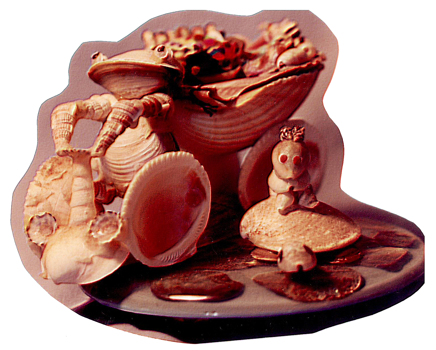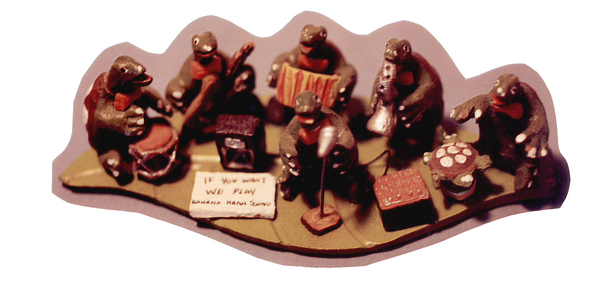 Frogs playing Bahama Mama Sound. As you approach the bowl you are caught by surprise as the melodic sounds of the Bahama Band create a tropical atmosphere. A talented ensemble of the best frogs in the business they can even play your requests! This piece which was purchased in the Cayman Islands has been dropped, shattered and then reglued countless times. Well worth the effort, don’t you think?