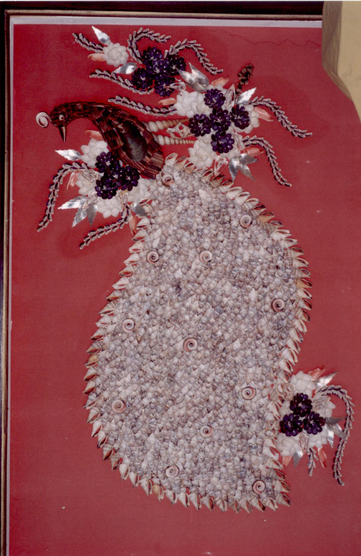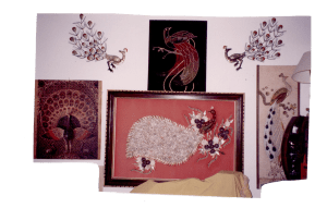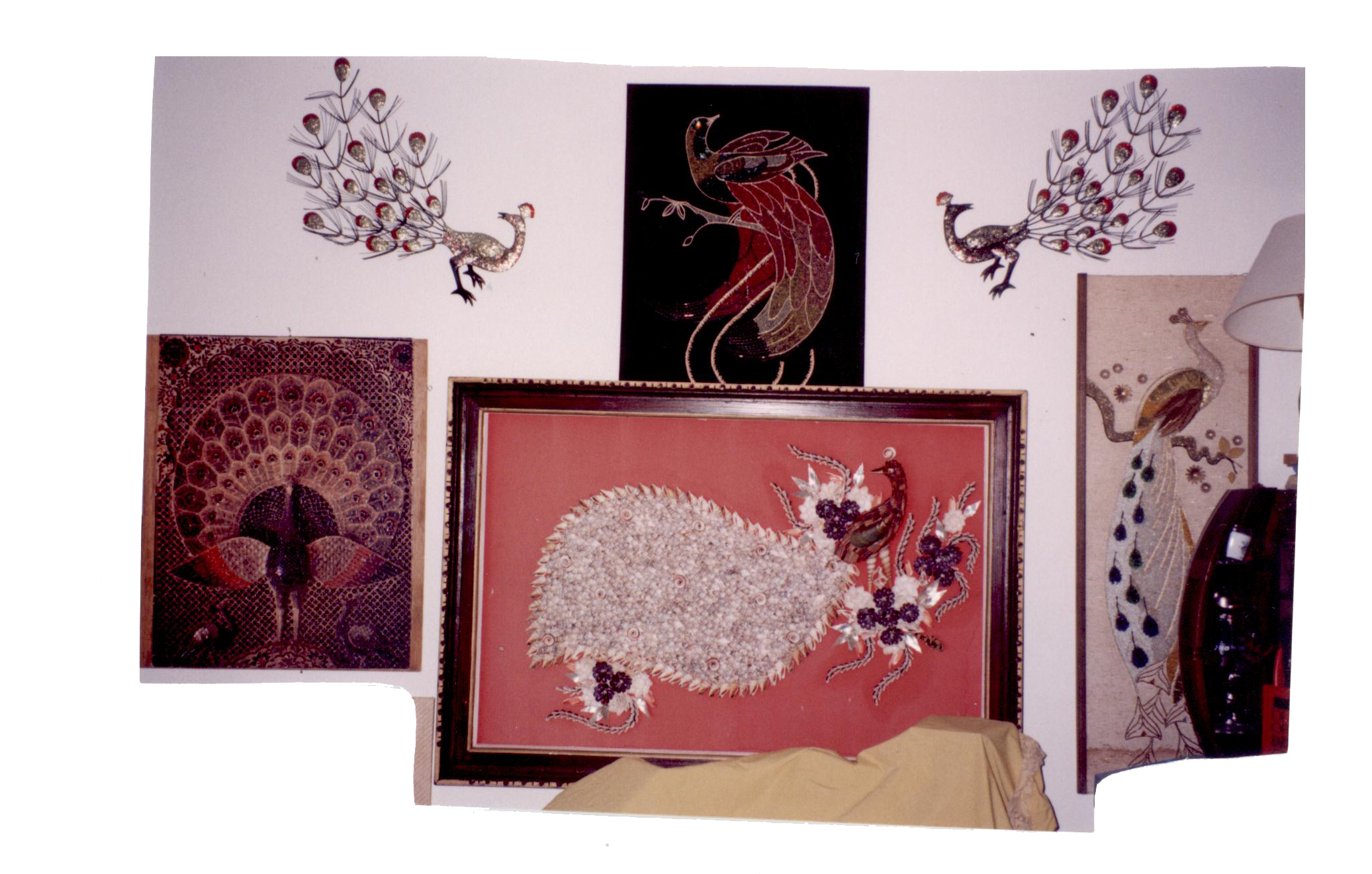 Peacocks Abound. Unique, colorful, simply sartorial our peacocks captured by unknown artists feature a variety of mediums including the magic of black velvet, sparkling stones, beads, shells and more shells and jigsaw puzzle configuration. No doubt on NBC’s must see list, our peacocks remain the private property of MONA LISA and any attempt to reproduce them will be greeted with the harshest legal ramifications unless there’s lots of money involved and then who knows we might be willing to deal.