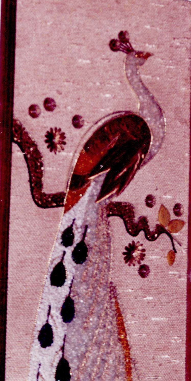 Shell Peacock on orange background. Truly the centerpiece of our peacocks on parade, when we first laid eyes on this extravaganza, it practically jumped off the wall and shrieked “take me home.” Although smitten, its intricate detail and huge size were off putting because these qualities suggested a big price tag and after all we’re on a budget of sorts. Not to worry, relatively speaking it was cheap, at $20.00 including the frame. As with so many other museum items, we marvel at the patience required to create a peacock out of hundreds if not thousands of individually glued on shells. The variety of type, shape and color is mind boggling. When time permits languish over this one.