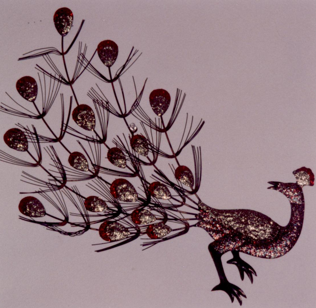 Pair of peacocks. Flanking our velvet peacock, are two painted metal full feathered friends each adorned with enough glitter to dazzle and temporary blind the on looker. Citing a bad feather day one of our pair refused to be photographed thus missing his 15 minutes of fame.