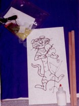 Within we found a black and white template of our tiger playing a fiddle, four different colored pebbles, dark brown, light green, yellow and orange (four of our most favorite colors), three colors of braid, black, gold and white, a container of somewhat hardened white glue and two unfinished wooden side frames. We estimated with between 12-15 hours of uninterrupted labor these materials could be transformed into a truly smashing Tiger Rag. If we can find a willing and qualified artist, we will have him/her make the tiger and photograph each painstaking step. Applications can be mailed in , faxed or e-mailed. Please do not arrive in person as the museum may not be open. In the meantime, we’ll have to be content with our imagination.