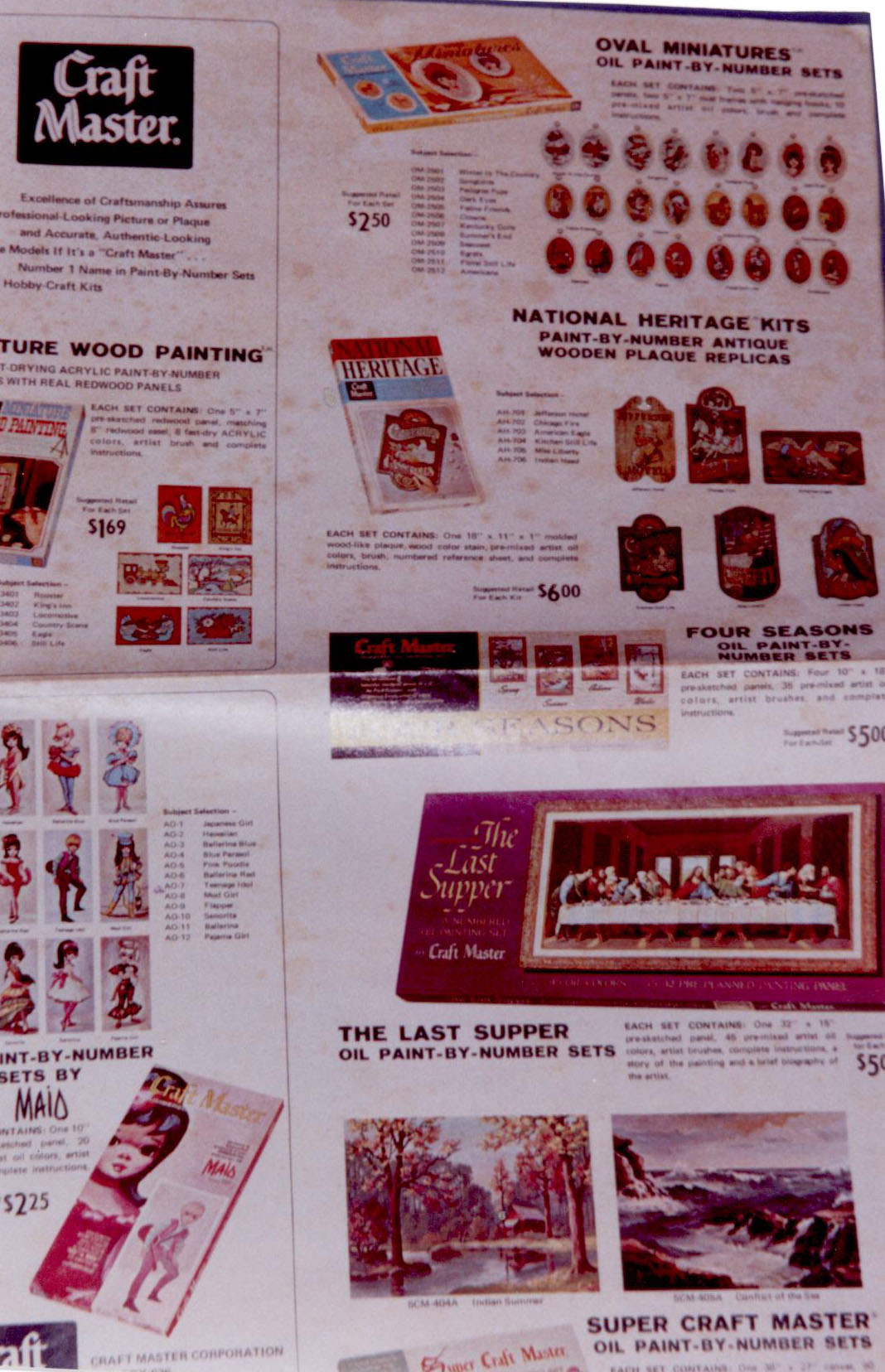 Craft Master, master ordering list. Another fabulous surprise. The complete array of paint by numbers available in 1969. Highlights include The Last Supper for $5.00 with 45 colors, and several different black velvet kits including playful colt, ebb tide, flower girl and hobo the clown at $3.00 each. Bridge over creek which is part of our art collection was not included here. What a glaring oversight.