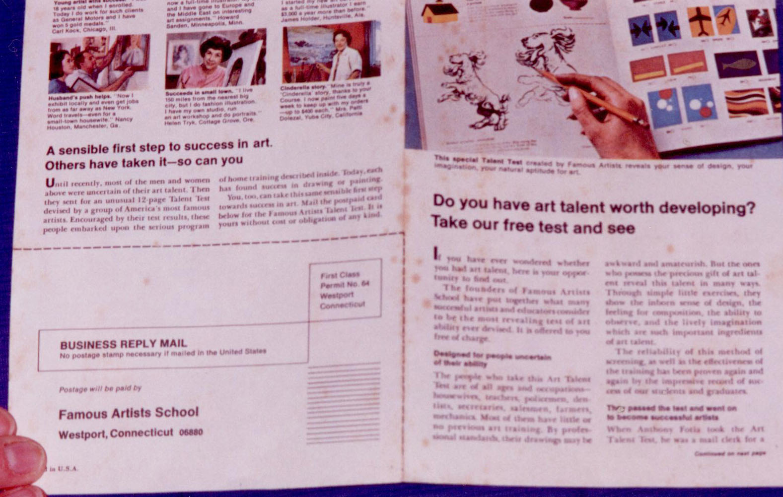 Do you have art talent worth developing? Tucked in with Blue Boy was a pamphlet from Famous Artists School in Westport, Connecticut promising a brilliant career in art if you can pass their free test. Just fill out the enclosed postcard and mail it in today for your free, that’s right free, Famous Artists Talent Test which reveals “your sense of design, your imagination, your natural aptitude for art.” No fly by night organization, their distinguished guiding faculty includes: Norman Rockwell, Al Kapp, Rube Goldberg and 30 unknown to us artists and is accredited by the Accrediting Commission National Home Study Council. Did anyone ever fail the test? We think not but are unwilling to take it ourselves. If you just must take this test and prove to yourself once and for all that you have the stuff of an artist plus are unbelievably gullible, feel free to write to Famous Artists School, Studio A-5974, Westport, Connecticut 06880 and request your free in-home test, that is if Famous Artist School is still around.