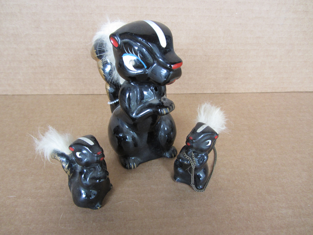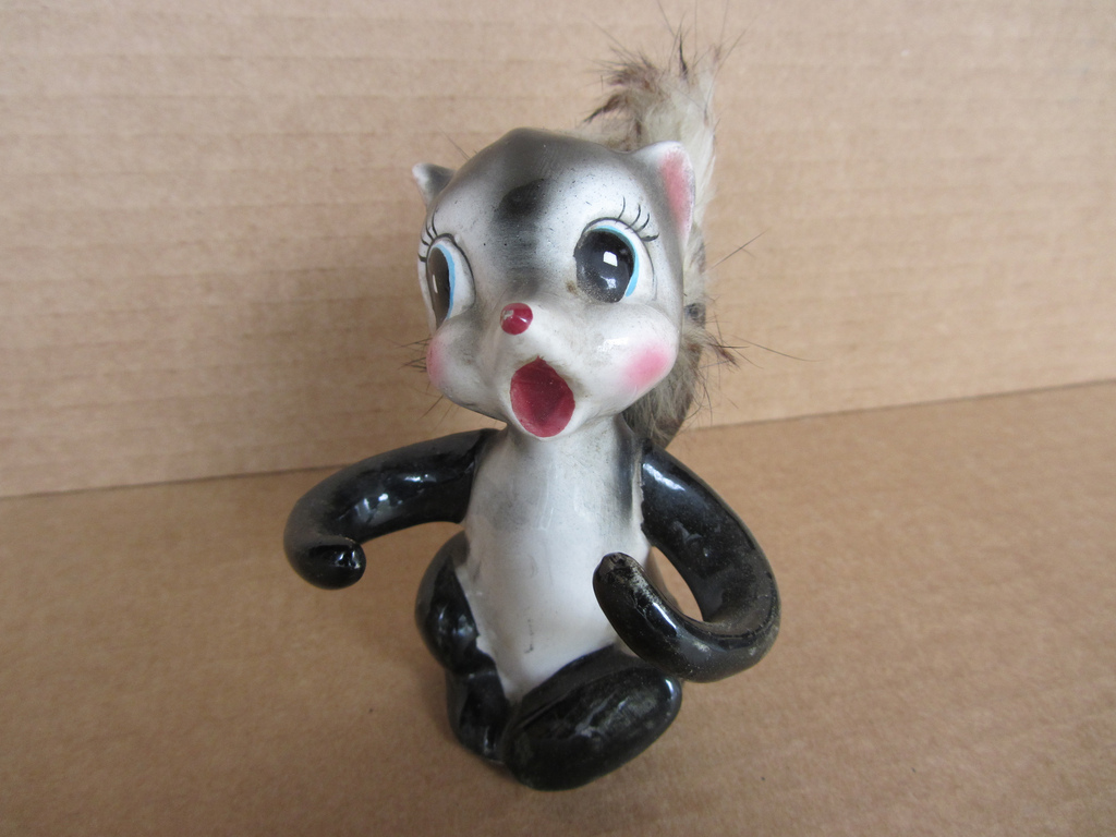 Whoever said that skunks were punks? Well maybe real ones are as they can cause a smelly stink. They certainly accomplished that at my home in Palos Verdes where their frequent visits were accompanied by their so smelly releases. The skunks sprayed their very distinguishable horrifying odor all over the outdoor deck and left me to clean up after them. Not my best effort. The only way to really get rid of the odor is that after whatever you use, just wait and hope they don’t return which sometimes they do and sometimes they don’t. But I’ve gone off track here, how unusual for me. Hmm. The two items included here are adorable skunks, as they are ceramic, not real and should be appreciated for their beauty and nothing else. So please study both of them.