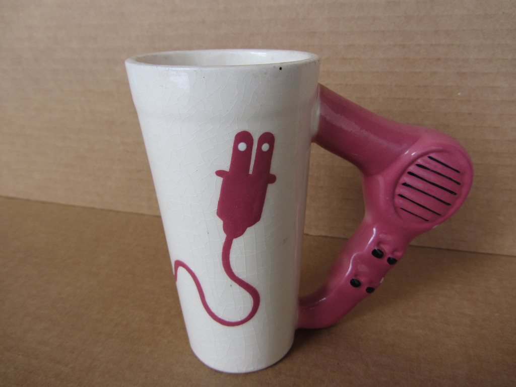 Hair Dryer Holder. What a lovely ceramic cup decorated to make sure you that this is the place to store your hairdryer – wonderful to have it easily available whenever you need it.