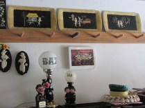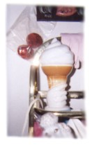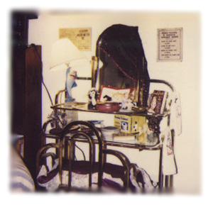 The table. This brass look table and bench were found for $15 locally. The mirror was broken and the top glass shelf was missing. Following our policy of never repairing anything, we cleverly covered the broken part of the mirror with the brown fringed scarf and put a silver plated tray from the Salvation Army in place of the missing top glass shelf. The matching bench remains wobbly with a crooked leg. We put a rose colored pillowcase with flowers and unicorn by Leonard Fisher for Panache II on the bench cushion to lend it an unmistakable air of whimsy. At that point it was time to adorn the table. We wanted the table to be adorable, romantic and functional. As always, you’ll have to be the judge on how well we succeeded, so here goes.