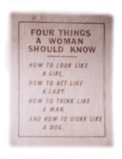Being a woman is, to say the least, a complicated existence filled with many, often conflicting areas in which expertise and grace are expected, hmm, perhaps taken for granted is a better way of describing the requirements. This exhibit looks at but a few of the areas in which a woman is assumed to be a consummate expert.