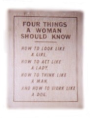 “Four things a woman should know” plaque. An incredible find at only 10 cents, proving that sometimes good advice is reasonable even in this day and age. The author isn’t cited but we’re pretty sure it was Gloria Steinem in her early feminist days. Such sage suggestions, we repeat them here: