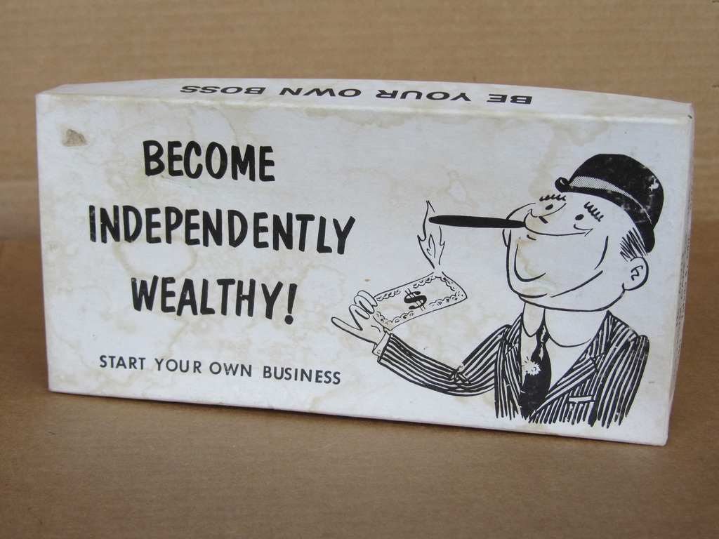 Wealth and Money. The top box cover declares – “Become Independently Wealthy” complimented by the drawing of a smiling man in a suit and top hat lighting his cigar with dollar bill which tells one and all that this is the kit you can’t live without.