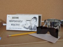 So here is the kit for the rest of us to use. It’s simple, complete and to the point – no complicated mathematical computer programming, no impossible expensive advice from a financial counselor or any confusing legal input is needed or wanted. Instead this kit concentrates on the 3 basic basics – DARK GLASSES, CUP AND PENCIL. The dark glasses are included as they are intended to protect your identity and thus they will prevent your investors or the authorities from knowing who you are. The cup I’m not as sure about, perhaps a place for someone to pay you for your invaluable help. The cup was no doubt chosen as a symbol to indicate the importance of simplicity and immediate accessibility of a place for your profits. I’d suggest you include an envelope in which to transfer any large contributions. The pencil, hmm, perhaps to write down your transactions so you can keep track of them, but I’d be cautious about taking the extra time needed to do this. Instead I’d opt for the “get the money and run” strategy, in which case a license plate free car would be a very important addition to your kit. But each of us must decide on our own what is absolutely necessary for our get rich kit. Good luck to one and all.