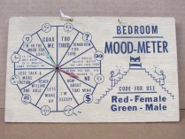 Bedroom Mood Meter. The Bedroom. Two lovers. Two arrows. Significantly, the female arrow is red and the male arrow is green, giving each an opportunity to indicate her/his choice concerning the hoped for activities of the evening or whenever. Please make sure to check out the options to choose from. And then try to imagine any chance of agreement. Hmm. Oddly or not so oddly, the kit doesn’t mention the after effects of the choices made on this meter which could be significant and everlasting and not necessarily in a good way. And I’m sure the Bedroom Mood Meter was not returnable so live with it, whatever effects it may turn out to have.