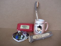Hill Billy Stuff. Fabulous hillbilly creations from southeastern Ohio include a corn squeezin’ cup complete with a self-identified corn cob tooth brush made with a stick and real corn cob materials for the brushing part. Not sure my teeth could ever handle such but then who knows for sure it probably would depend on the other tooth hygiene options available. The Hill Billy ash tray featuring the local guys drinking some home brewed brew while smoking is a perfect place to dump your cigarette droppings. A wood flashlight, or so that’s what it calls itself according to the scraped in letters on the handle is the easiest to use flashlight I’ve ever seen – no batteries needed – just a flame to light the match sticking out of the stick flashlight. And then if you need to use it again, it’s so simple put in another match and wait for a flame. So simple along as you don’t burn anything down. Last is a truly remarkable, never seen before sweeper that when pressed against the dirty surface somehow brushes the waste away. I don’t understand how it works but so what it works. Amazing. All in all a brilliant look at creating that which is needed for very little if any money with stuff that’s just lying around. I’m impressed. Hope you are as well.