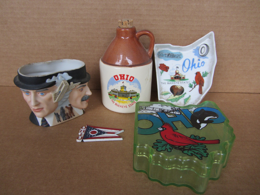 Ohio. Take a close look at this photo which includes a Wright Brothers cup in which to put coffee, tea or whatever. It features the heads of both Wright Brothers, each in beautifully rendered colors, with a background of their famous plane the first to fly. I got this appropriately enough at the Dayton airport. A perfect pairing! Next is a hand painted pottery whiskey jug with handle and cork for homemade corn squeezin’s. Worth a few sips if only there were some downhome whiskey within. Alas one must pretend, shouldn’t be that difficult as most of living in Ohio involves pretending one thing or another. The last two features both highlight the map of Ohio, one on white china and other in green plastic. The latter has been a good holder of various stuff, the other I guess is for show only, but why not.